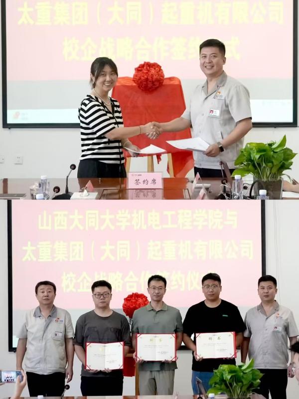 7月16日,机电工程学院与太重集团(大同)起重机有限公司战略合作签约暨实践教学基地揭牌仪式顺利举行。学院副院长李妍姝,公司生产总监解军出席并讲话。公司生产部长张华雄、技术部长杨金磊、工艺副部长王泽及学院领导及教师代表参加签约仪式,太重集团(大同)起重机有限公司综合总监郝耀光主持。