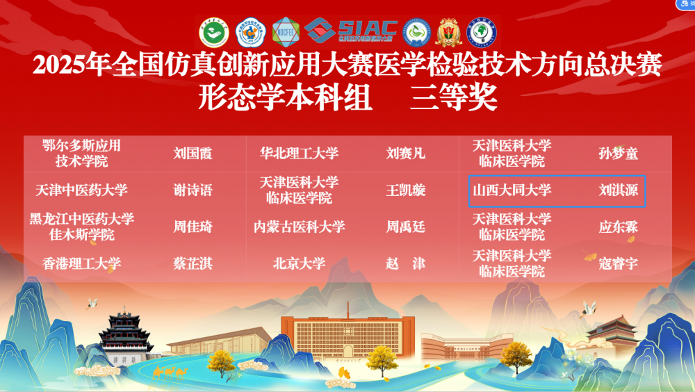 7月17日至20日,全国仿真创新应用大赛医学检验技术方向总决赛在陕西中医药大学落幕。今年会医学部首次组队参赛,由2022级医学检验技术专业学生刘淇源以及指导教师王健、杨晶(附属第一医院)组成的队伍,在全国总决赛中获形态学本科组三等奖。