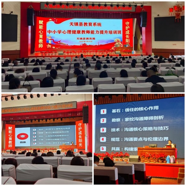 为助力县域中小学校提升校园心理健康教育专业化水平,筑牢中小学生心理健康防线8月25日,学生工作部赴天镇县为中小学心理健康教师开展能力提升培训专题讲座。本次讲座由天镇县教育局主办,旨在提升当地心理健康教育水平,以更好地应对日益突出的中小学生心理问题。天镇县教育局领导、各学校相关负责人、中小学心理健康教师、班主任及家长代表等400余人到场聆听,现场学习氛围浓厚,反响热烈。