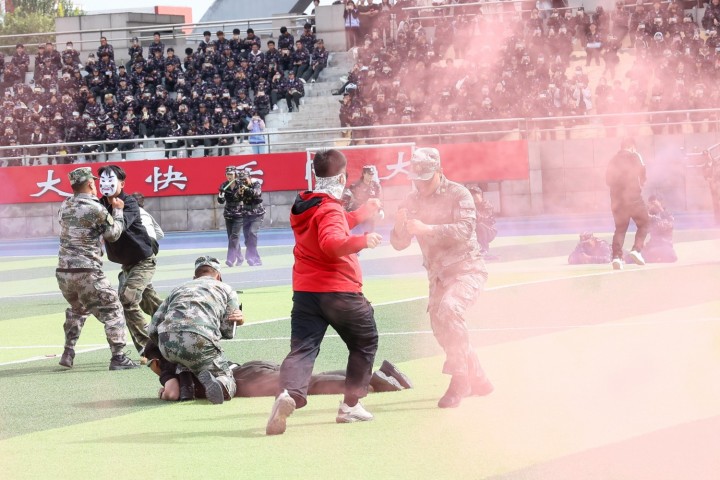 分列式结束后,同学们带来了精彩的军体拳和匕首操表演,一招一式精准有力,刚劲齐整的喊声响彻云霄,尽显同大学子青春风采。由20名军训教官和15名同学共同呈现战术擒敌综合演练展示,动作迅猛凌厉,战术配合紧密有序,展现同学们应对校园突发安全事件的能力。