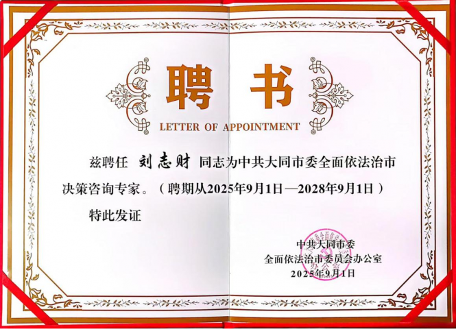 中共大同市委全面依法治市委员会办公室是统筹推进全市法治建设的重要机构,主要职责包括协调推进依法治国、依法执政、依法行政,研究处理全面依法治市重大事项等。本次聘任经公开推荐、严格评审等程序,从全市71名候选人中择优遴选出15名专家。刘志财老师凭借扎实的专业能力和丰富的实务经验成功入选。