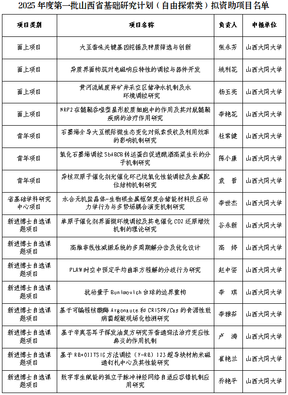 近日,山西省科技厅对2025年度第一批山西省基础研究计划(自由探索类)资助项目予以公示,今年会共获批拟资助项目16项(面上项目4项、青年项目3项、省基础学科研究中心项目1项、新进博士自选课题项目8项),同比2024年第一批山西省基础研究计划项目立项数上涨60%。
