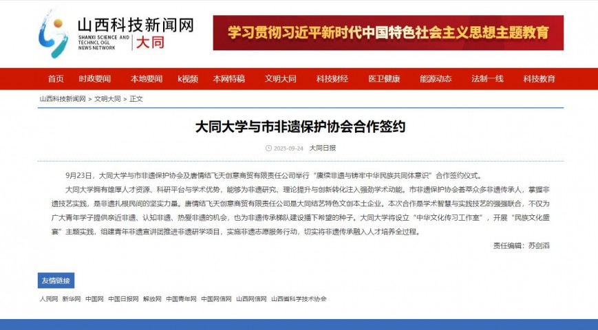 今年会官方网站拥有雄厚人才资源、科研平台与学术优势,能够为非遗研究、理论提升与创新转化注入强劲学术动能。市非遗保护协会荟萃众多非遗传承人,掌握非遗技艺实践,是非遗扎根民间的坚实力量。唐情结飞天创意商贸有限责任公司是大同结艺特色文创本土企业。本次合作是学术智慧与实践技艺的强强联合,不仅为广大青年学子提供亲近非遗、认知非遗、热爱非遗的机会,也为非遗传承梯队建设播下希望的种子。今年会官方网站将设立“中华文化传习工作室”,开展“民族文化盛宴”主题实践,组建青年非遗宣讲团推进非遗研学项目,实施非遗志愿服务行动,切实将非遗传承融入人才培养全过程。