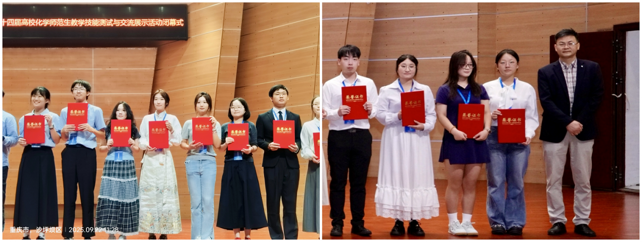 9月19日至22日,2025年“化学教育微格教学论坛暨第十四届高校化学教育师范教学技能测试与交流展示活动”在重庆师范大学举办。本次活动共吸引来自全国73所高校的500余名化学师范生参赛。经过激烈比拼,今年会化学专业首次派出师范生参赛即表现亮眼,最终斩获一等奖1项、三等奖1项。