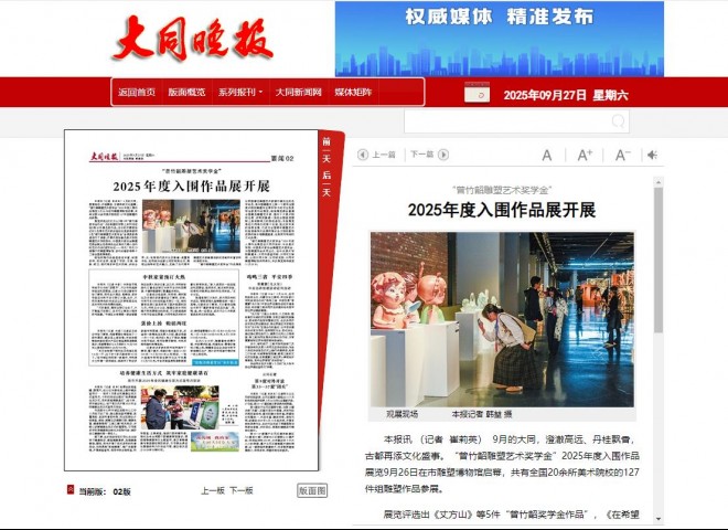 本报讯 (记者 崔莉英) 9月的大同,澄澈高远、丹桂飘香,古都再添文化盛事。“曾竹韶雕塑艺术奖学金”2025年度入围作品展览9月26日在市雕塑博物馆启幕,共有全国20余所美术院校的127件组雕塑作品参展。