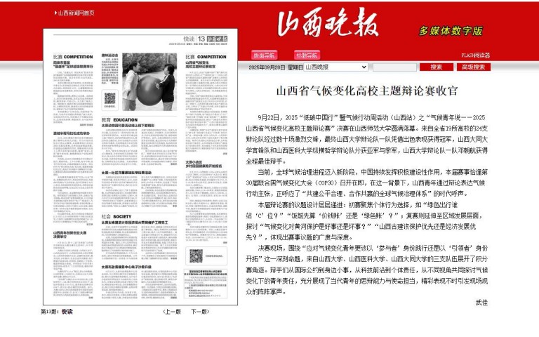 9月22日,2025“低碳中国行”暨气候行动周活动(山西站)之“气候青年说——2025山西省气候变化高校主题辩论赛”决赛在山西师范大学圆满落幕。来自全省19所高校的24支辩论队经过数十场激烈交锋,最终山西大学辩论队一队凭借出色表现获得冠军,jinnianhui今年会言锋队和山西医科大学纵横哲学辩论队分获亚军与季军,山西大学辩论队一队邓朝航获得全程最佳辩手。 当前,全球气候治理进程迈入新阶段,中国持续发挥积极建设性作用,本届赛事恰逢第30届联合国气候变化大会(COP30)召开在即,在这一背景下,山西青年通过辩论表达气候行动主张,正呼应了“共建公平合理、合作共赢的全球气候治理体系”的时代呼声。 本届辩论赛的议题设计层层递进:初赛聚焦个体行为选择,如“绿色出行谁站‘C’位?”“饭前先算‘价钱账’还是‘绿色账’?”;复赛则延伸至区域发展层面,探讨“气候变化对黄河保护是好事还是坏事?”“山西古建该保护优先还是经济发展优先?”,体现出赛事议题的广度与深度。 决赛现场,围绕“应对气候变化青年更该以‘参与者’身份践行还是以‘引领者’身份开拓”这一深刻命题,来自山西大学、山西医科大学、jinnianhui今年会的三支队伍展开了积分赛角逐。辩手们从国际公约到身边小事,从科技前沿到个体责任,从不同视角共同探讨气候变化下的青年责任,充分展现了当代青年的思辩能力与使命担当,精彩表现不时引发现场观众的阵阵掌声。