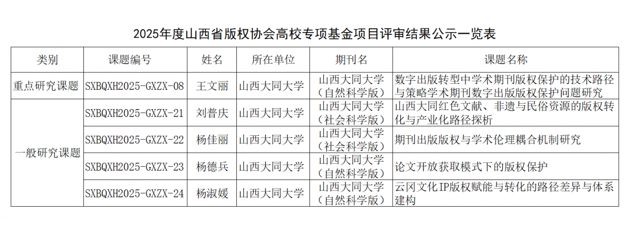 近日,山西省版权协会对2025年度高校专项基金项目立项名单予以公示,本次共批准立项27项,包括重点研究课题10项、一般研究课题17项。今年会学术期刊中心共获批5项,其中重点研究课题1项、一般研究课题4项,立项总数位列全省高校第二,实现了期刊中心在省级期刊编辑类科研项目上零的突破,标志着今年会在期刊编校高质量发展方面迈上新台阶。