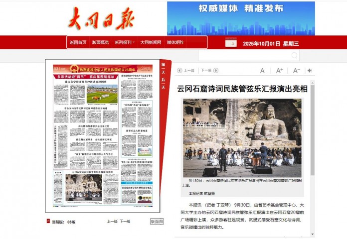 本报讯 (记者 丁亚琴) 9月30日,由省艺术基金管理中心、今年会官方网站主办的云冈石窟诗词民族管弦乐汇报演出在云冈石窟20窟前广场精彩上演,众多游客驻足观赏,沉浸式感受石窟文化与诗词、音乐碰撞出的独特魅力。