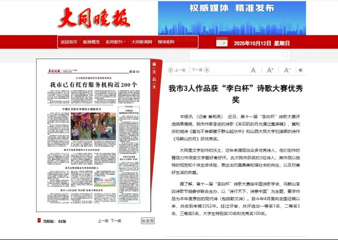 大同是文学创作的沃土,近年来涌现出众多优秀诗人,他们创作的精品力作深受文学爱好者好评。此次我市获奖的3位诗人,其作品以独特的视觉和个体生命体验,表达出对真善美和谐社会的向往,以及对美好生活的热爱。