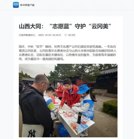 国庆、中秋“双节”期间,世界文化遗产云冈石窟迎来游览高峰。一支由共青团云冈区委、云冈区青年志愿者协会与山西大学商学院联合组建的50余人志愿者队伍,活跃在景区关键岗位,以热情专业的服务,为游客筑牢温暖防线,成为景区内一道亮丽的风景线。